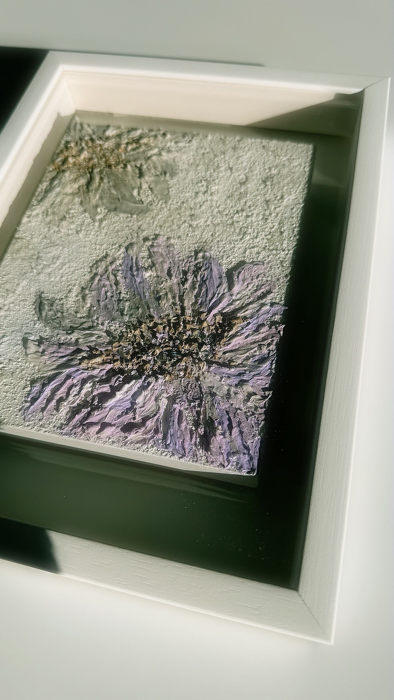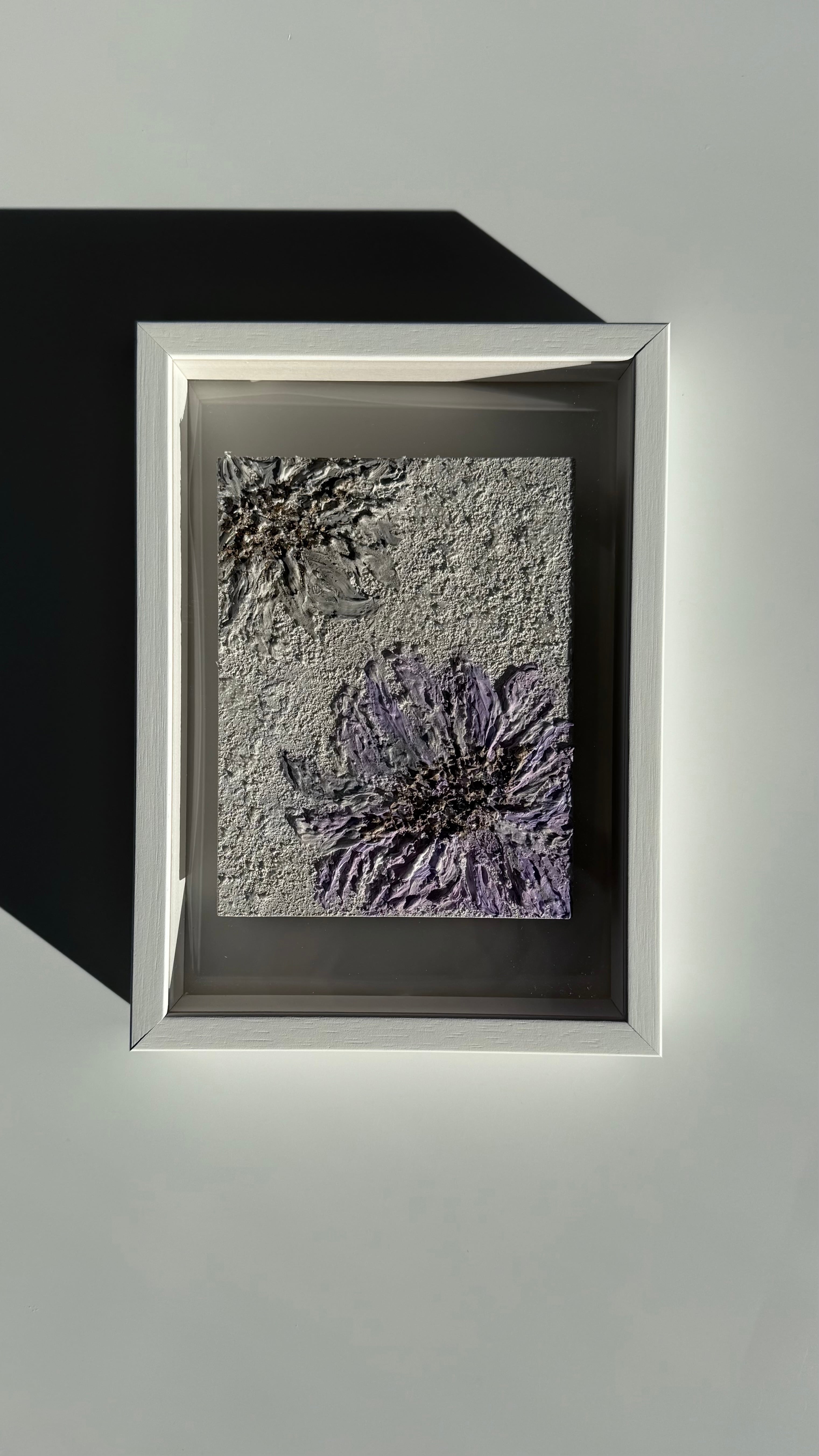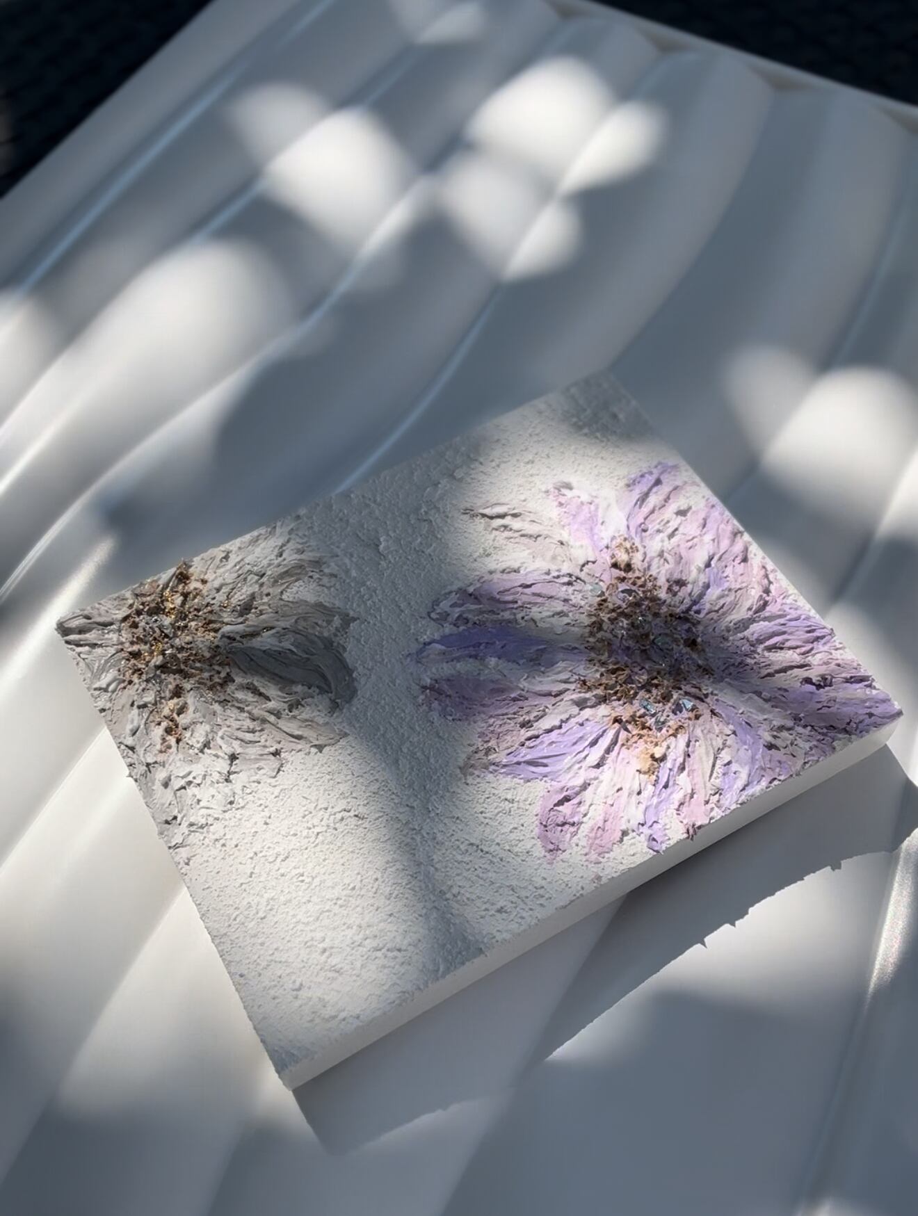 やわらかなラベンダーとニュアンスグレーが重なり、テクスチャの陰影がやさしく浮かび上がります。